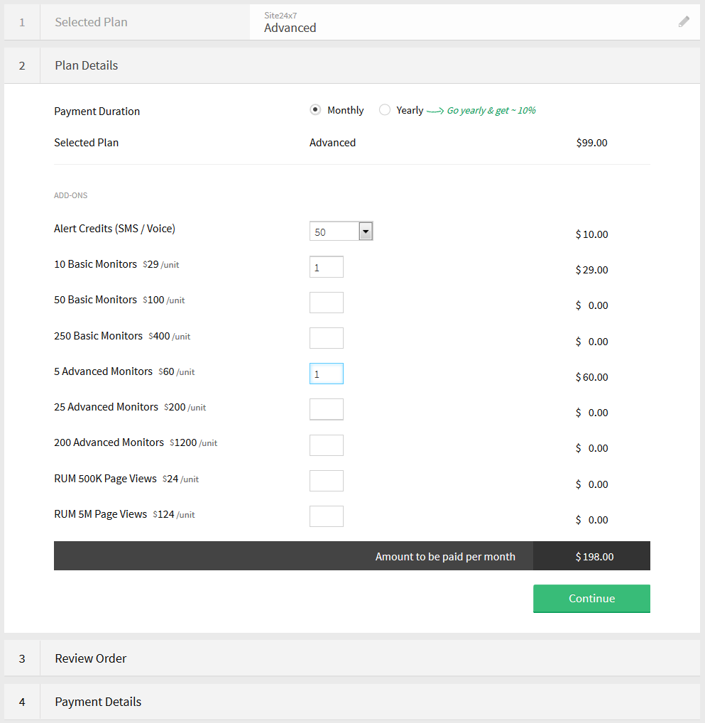 Our subscription model has a concept of basic and advanced monitors. Each subscription package has a set number of basic and advanced monitors. You can choose a specific package based on your business needs and further top-up your pack by purchasing additional add-ons and alert credits. At any given point during your current subscription cycle, you have the freedom to switch over to a different package. We support payment via Credit Card, Paypal and Purchase Order. All payments via Credit Card or PayPal will be auto renewed based on the payment duration opted by you.