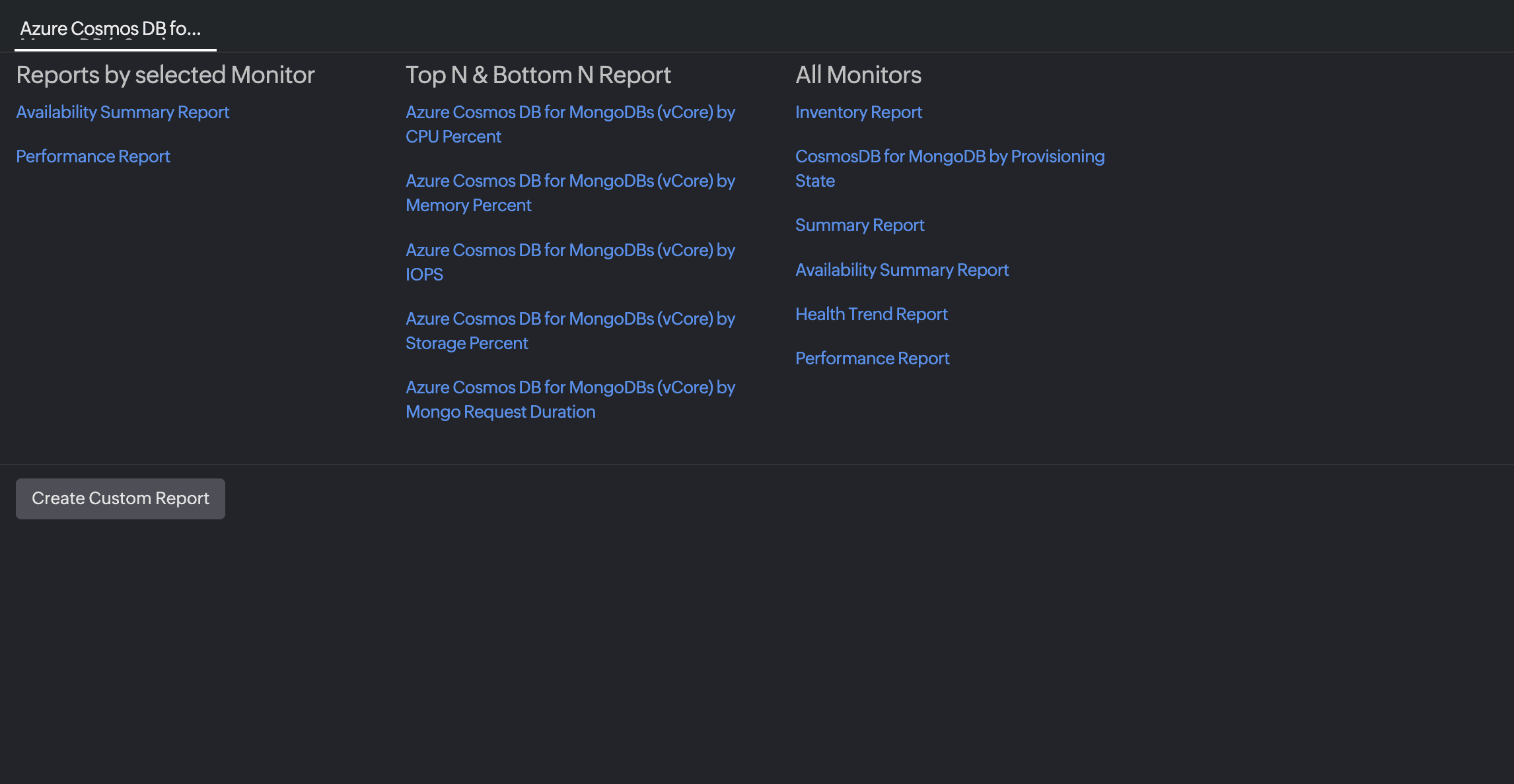 You can find the Availability Summary Report, Inventory Report, and Performance Report for one selected monitor, or you can get the Summary Report, Availability Summary Report, Health Trend Report, and Performance Report for all the Cosmos DB for MongoDB (vCore) monitors.