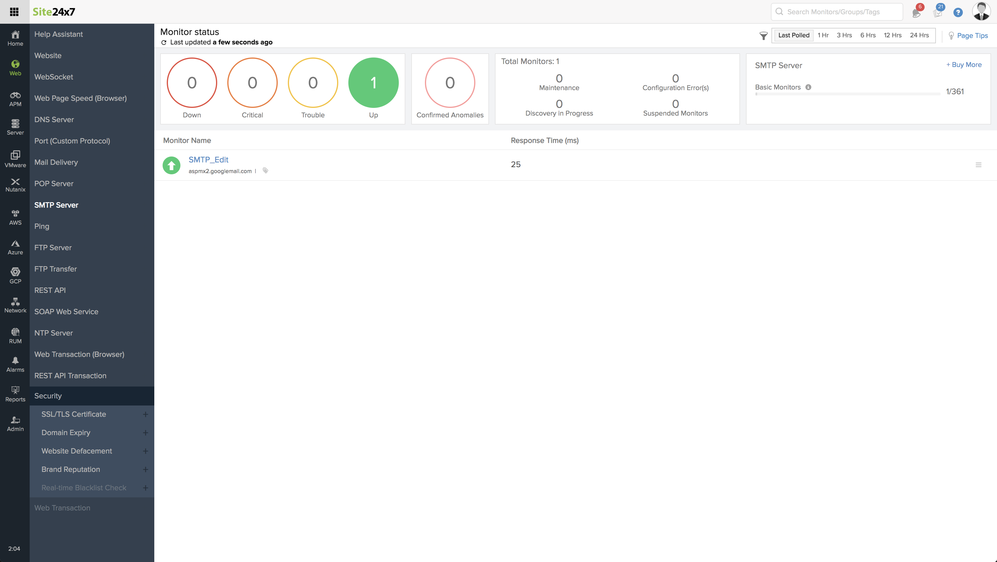 Site24x7's SMTP Server Monitor checks for the accessibility of your SMTP server and notifies you with instant alerts when the response time crosses the configured threshold. Any performance bottleneck can be well detected, before it snowballs into a major issue. In the status banner, you can view the total number of monitors based on their operational status and state. You can also view the number of operational monitors and alert credits remaining in your account. By clicking the "+ Buy More" button, you can purchase additional monitors and alert credits. To view the desired performance metrics, navigate to Home and click the desired SMTP Server Monitor. The metrics are displayed in graphical and tabular layouts for your easy assimilation.