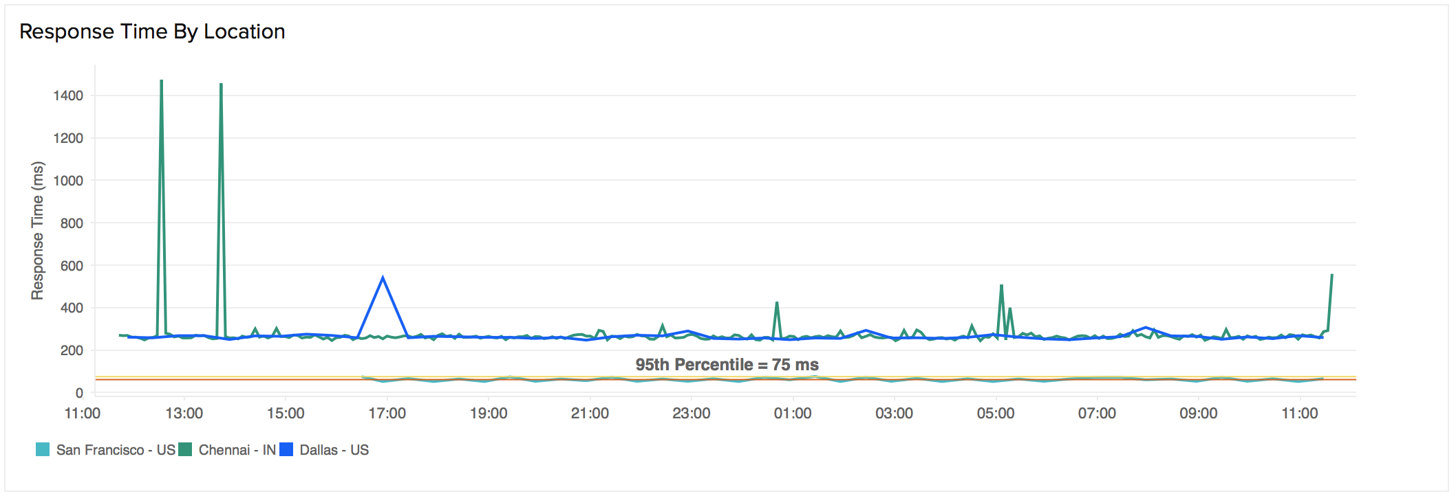 Response Time by Location graph shows the median response time for each day or hour for each monitoring location. This can be utilized to check the average response time of your monitors from different monitoring locations. Location legend is provided with the graph for easy administration.