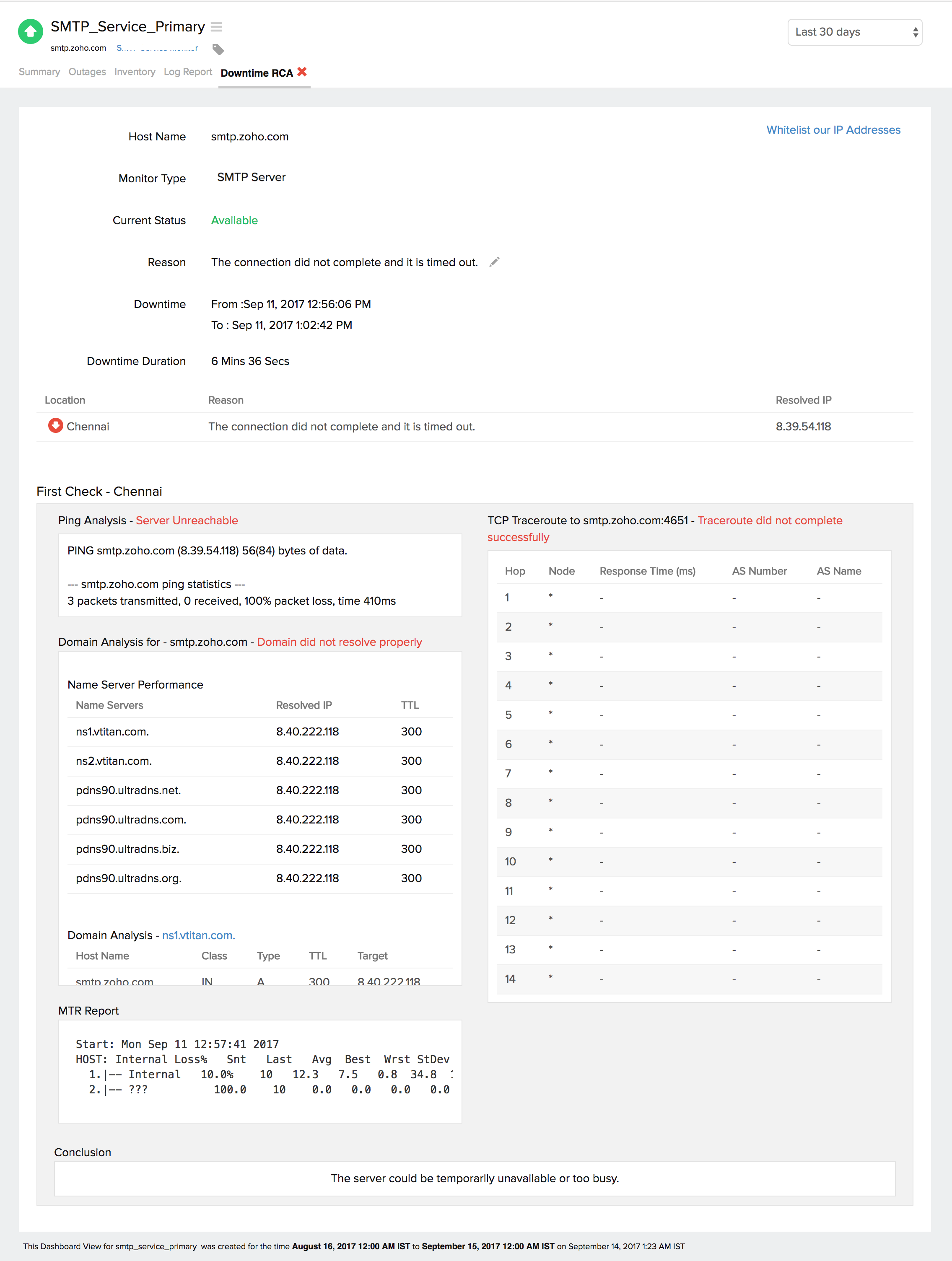 You can retrieve indepth root cause analysis report for your DOWN monitors after 150 seconds of the monitor reporting the outage. RCA Report gives basic details about your monitor, outage details, recheck details and reasons for the outage. Root Cause Analysis automatically generates a plethora of information to arrive at a definite conclusion as to what triggered a downtime. RCA intends to determine the root cause of specific downtime or performance issue. A normal RCA report will comprise of the following details: