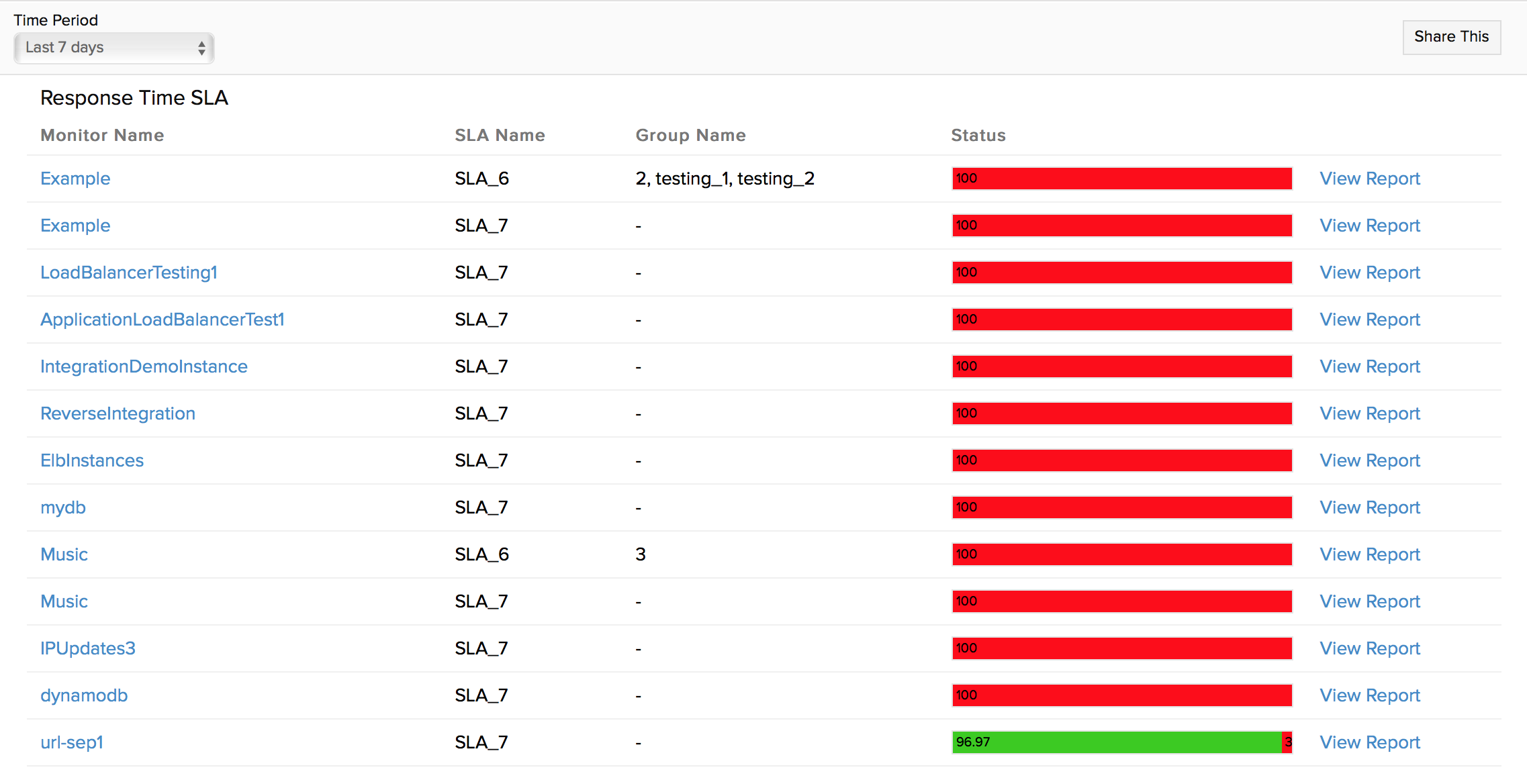 You can choose a time period that ranges from today to as long as 30 days back. Additionally, you can also use the Custom Period option to create an SLA report for the date range less than 100 days. When you choose the start date in custom period, the end date will be limited to 99 days ahead from the start date. It allows you to view and share quarterly SLA reports with your clients. Custom period is supported only in specific monitor level and not across monitors.