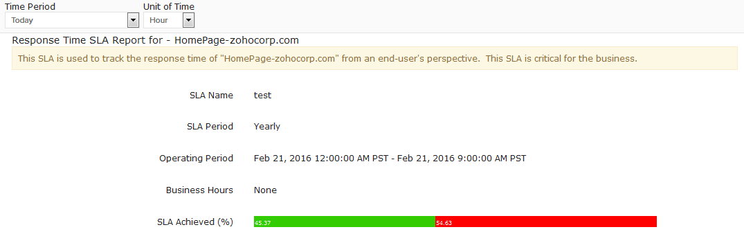 For example, assume you have defined a business hour named 'Friday' as between 08:00 to 20:00 hours. This time frame is applicable every Friday. Now if you specify this business hour for the SLA, the SLA will be considered for a time period of 08:00 to 20:00 hours on Fridays. - SLA Achieved (%): To meet the SLA, response time can be set as equal to, greater than, greater than equal to, less than or less than or equal to a numerical value. By default, it is 1000 ms. SLA achieved (%) highlights the range of SLA achieved by the monitor. The achieved status is highlighted in green with the corresponding percentile value and the other part is presented in red color.